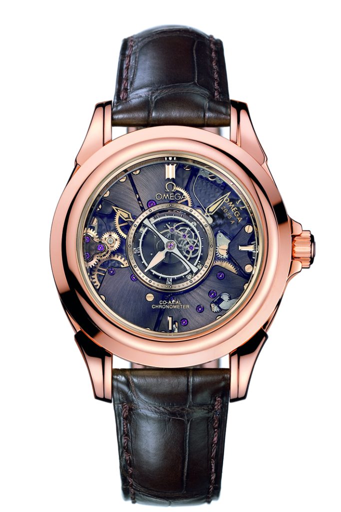 For the trophy and green jacket presentation, he chose to wear an OMEGA De Ville Tourbillon numbered edition, crafted in 18K red gold and presented on a brown leather strap.(513.53.39.21.99.001)